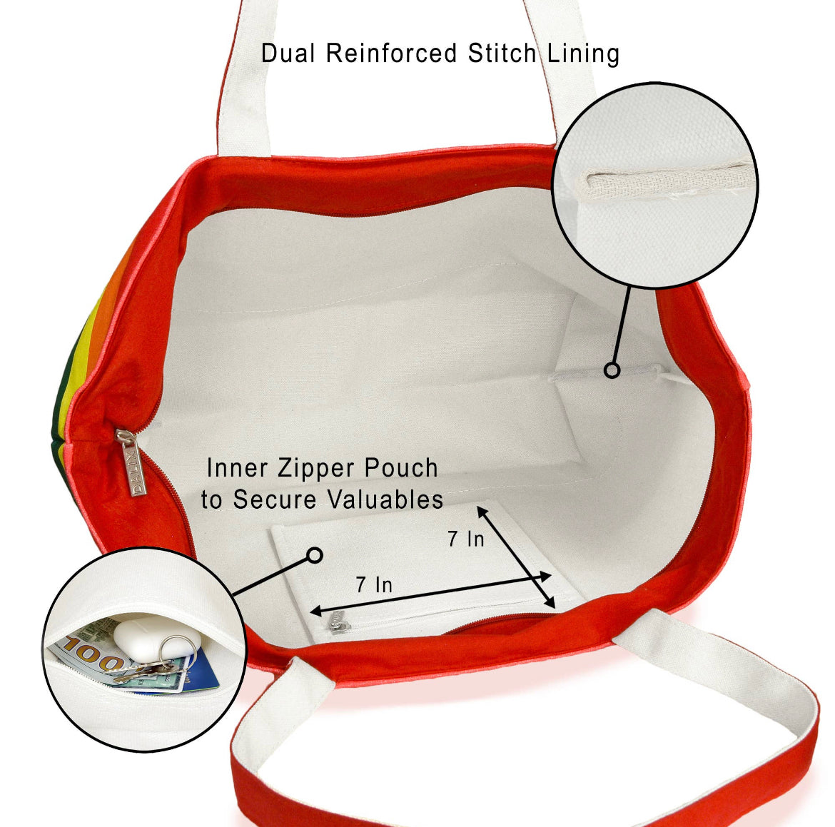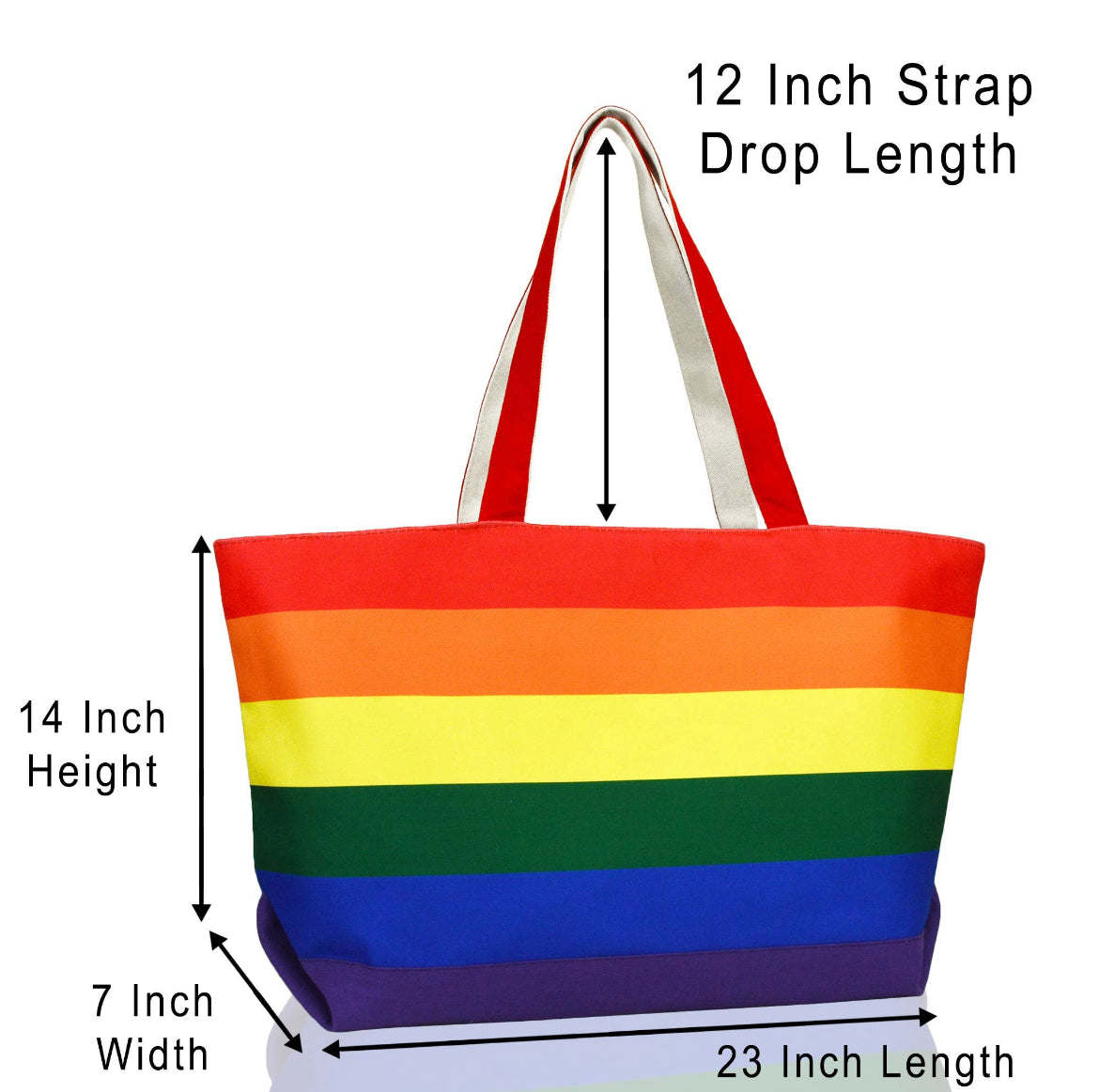 this OH SO CUTE Striped Rainbow Tote is perfect to take on an upcoming vacation or a nice day at the beach. This tote is constructed with premium 18 oz. cotton canvas, holding its sturdy shape, which stands on its own so you can easily find your items without having to hold the bag open. The stripe colors have a protective polyester outer layer, to ensure a long-lasting result of vibrant colors for years of usage while not affecting the quality of the bag. The shoulder strap is easily transferable as a handbag with a 12 inch drop length, and features a double-cross stitch which supports heavy loads in any cases such as travels, or grocery shopping: graciously lined with Red and White to complement the color theme. Smooth DALIX zipper handles and zipper track will leave you opening and closing to secure your bag with ease.